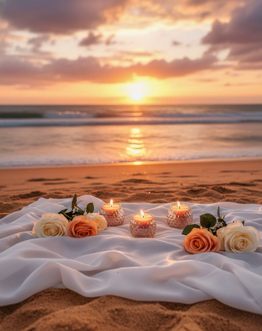 Each flame flickers with intimate warmth, turning the shoreline into a romantic sanctuary